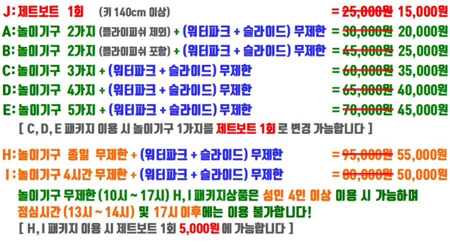| 아토믹수상레저 | ● 놀이기구 패키지 ① 놀이기구 당일 패키지 (3,4,5가지 선택) - 40,000원 ~ 55,000원 ② 놀이기구 무제한 패키지 (오전, 오후, 종일 무제한) - 50,000원 ~ 70,000원 ● 평일 특가 숙박패키지 (4인총요금) - 400,000원 ~ 480,000원 ● 입장권 또는 워터파크입장권 - 15,000원 (50%할인) ● 주말 특가 숙박패키지 (4인총요금) - 440,000원 ~ 560,000원 |