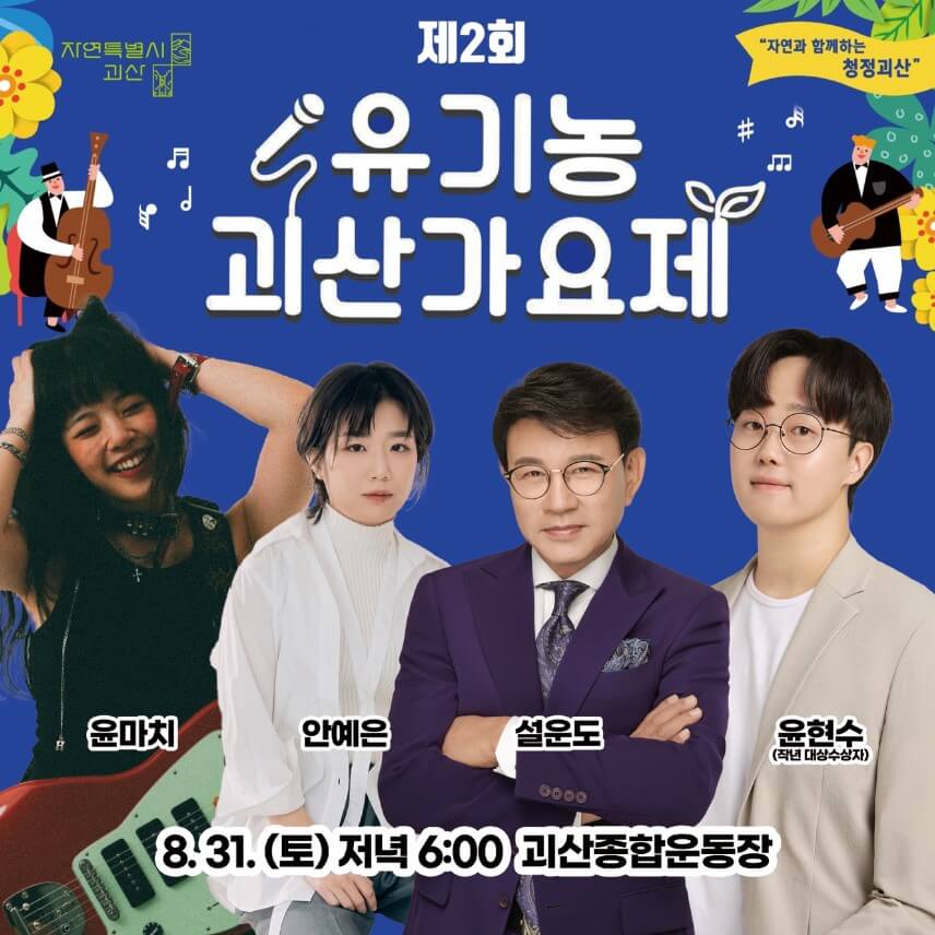 | 2024.08.31(토) 18:00 | 괴산종합운동장 | 설운도, 안예은, 윤마치, 윤현수(작년 대상수상자) |